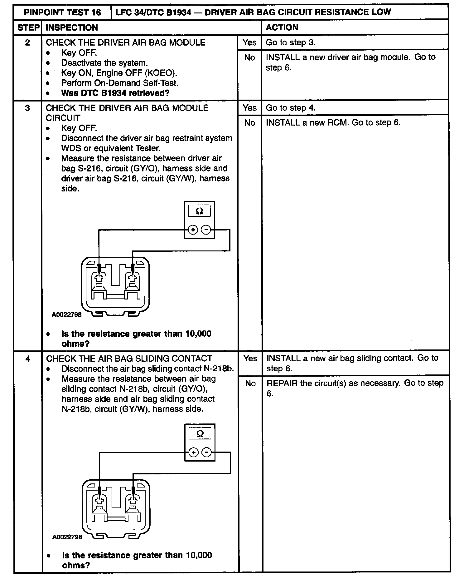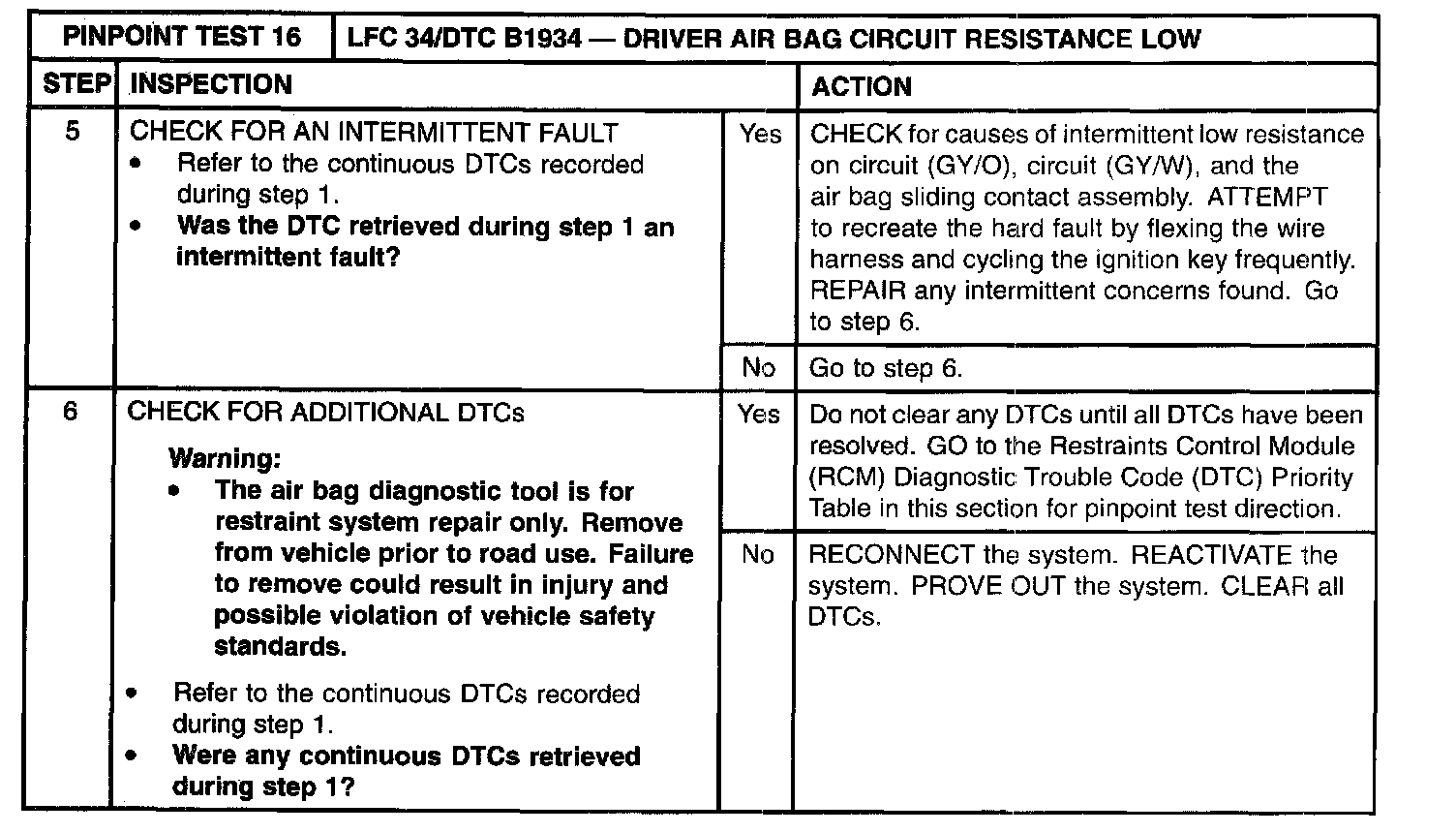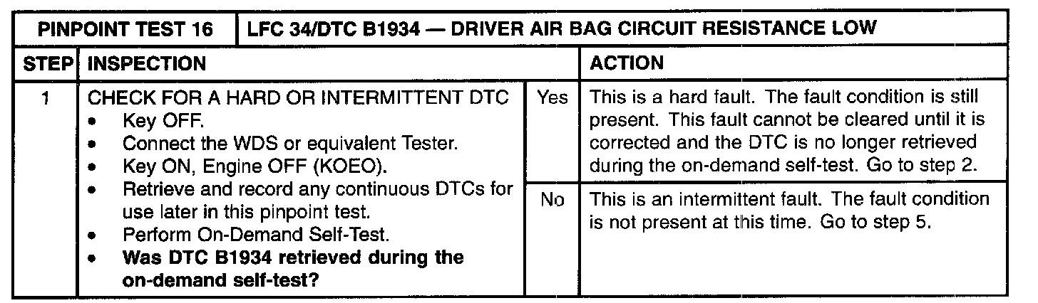 Pinpoint Test 16: LFC 34/DTC B1934 - Driver Air Bag Circuit Resistance LowNormal Operation