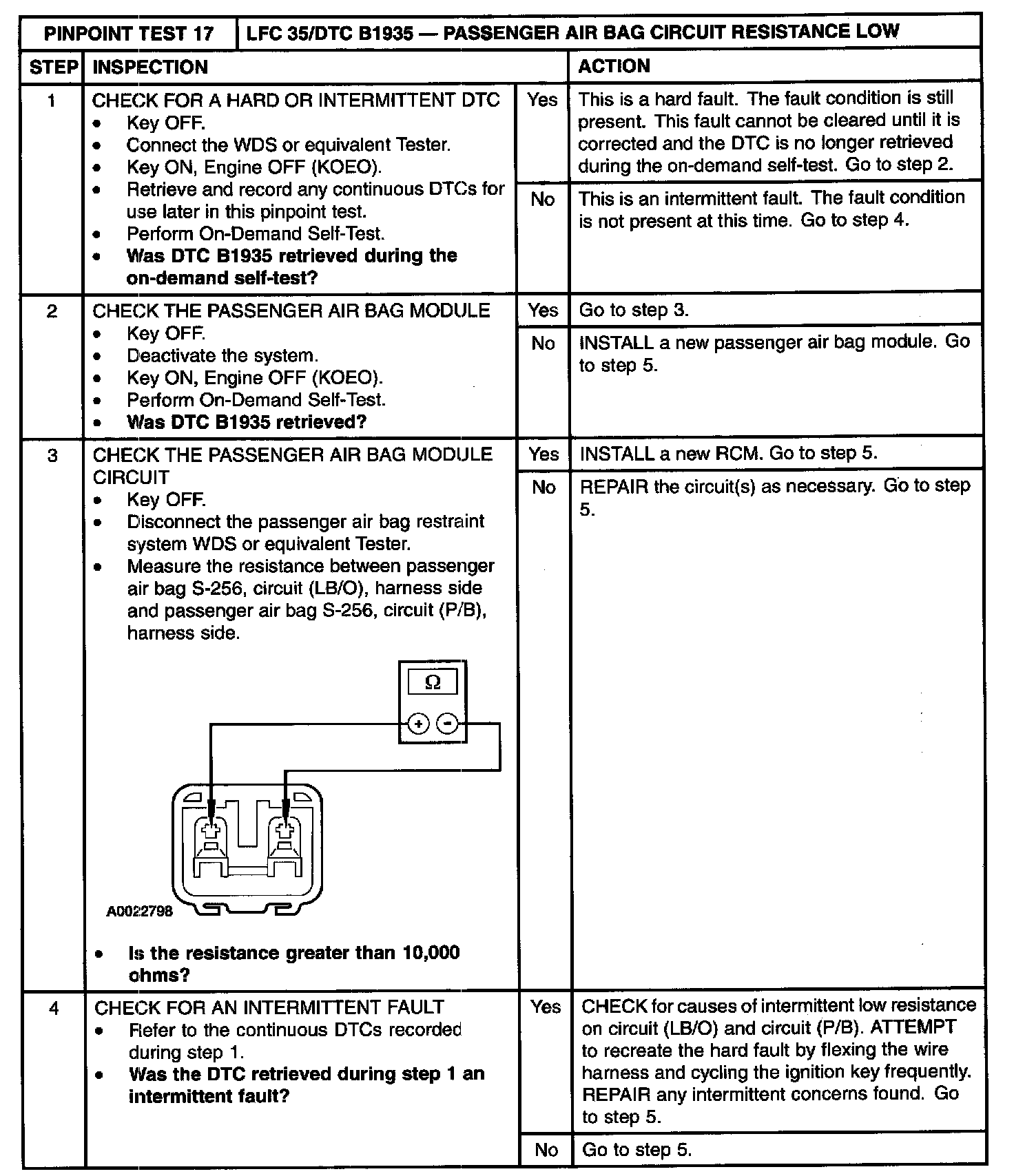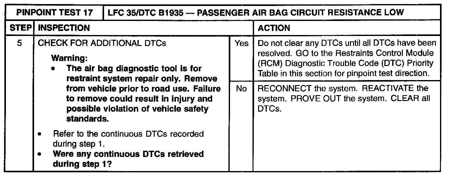 The restraints control module (RCM) monitors the resistance of the passenger air bag ignitor by measuring the resistance between pins 6 and 7. If the RCM detects low resistance between these pins, it will store a diagnostic trouble code (DTC) B1935 in memory and flash a lamp fault code (LFC) 35 (or higher priority code if one exists) on the air bag indicator.