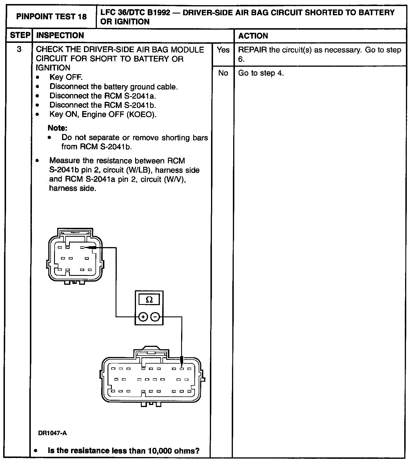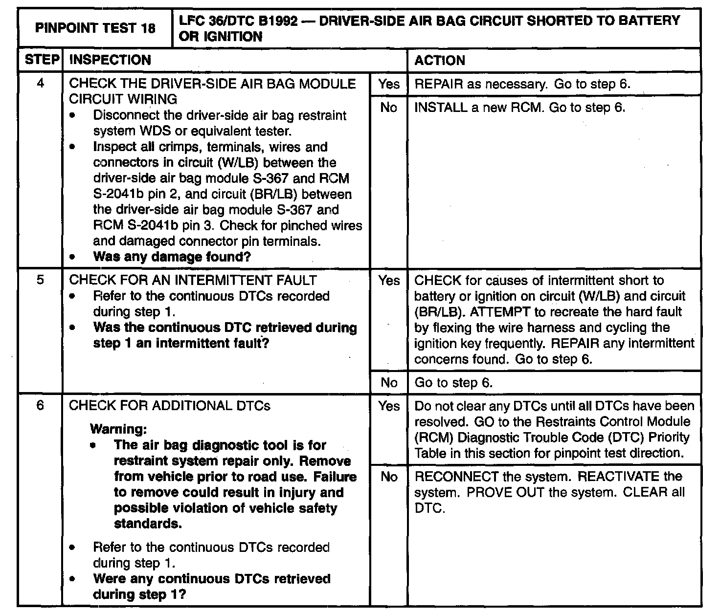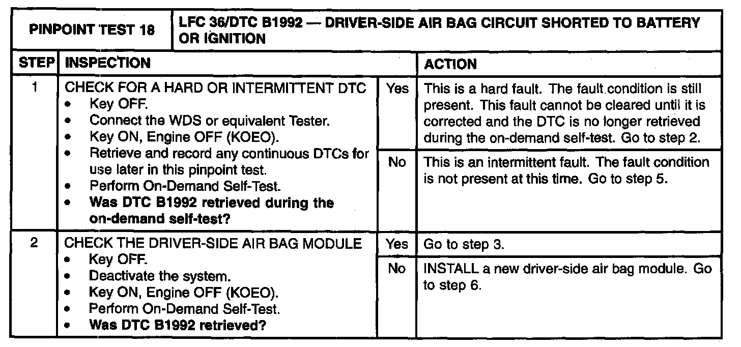 The restraints control module (RCM) monitors the driver-side air bag circuits at RCM S-2041a and S-2041b, pins 2 and 3 for a short to battery or ignition. If battery or ignition voltage is detected, the RCM will store diagnostic trouble code (DTC) B1992 and flash lamp fault code (LFC)36.