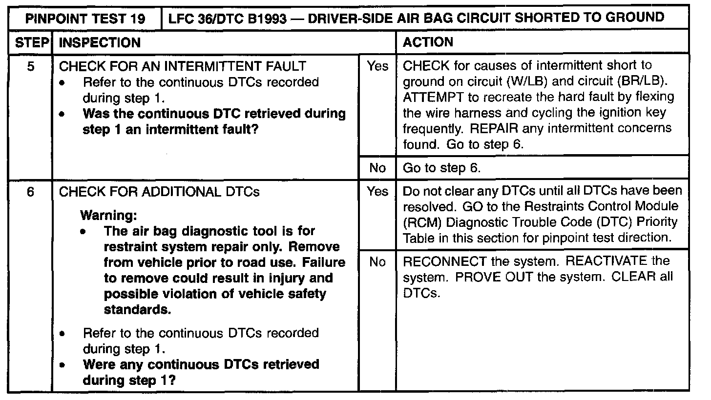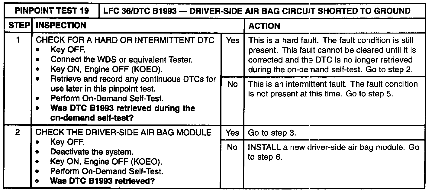 Pinpoint Test 19: LFC 36/DTC B1993 - Driver-Side Air Bag Circuit Shorted to GroundNormal Operation