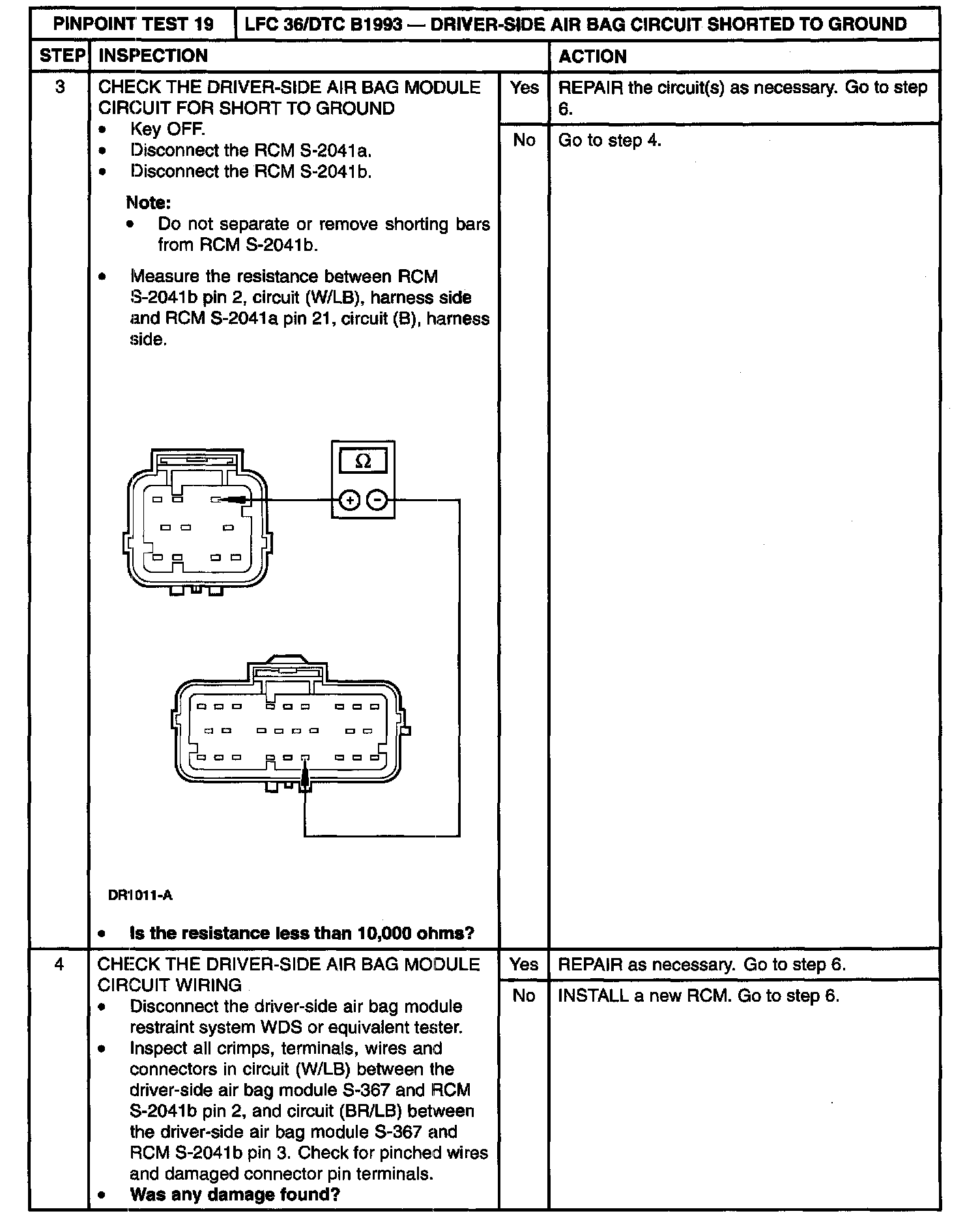 The restraints control module (RCM) monitors the resistance to ground at RCM S-2041 a and S-2041 b, pins 2 and 3. If the resistance is less than 1000 Ohm at either pin, the RCM will interpret that as a ground short, store diagnostic trouble code (DTC) B1993 and flash lamp fault code (LFC) 36.