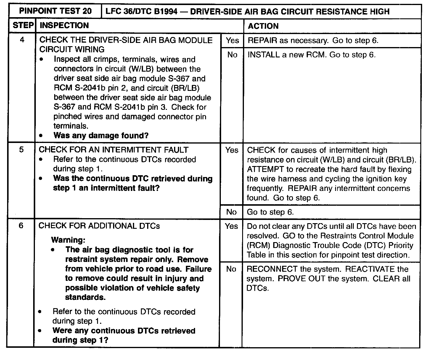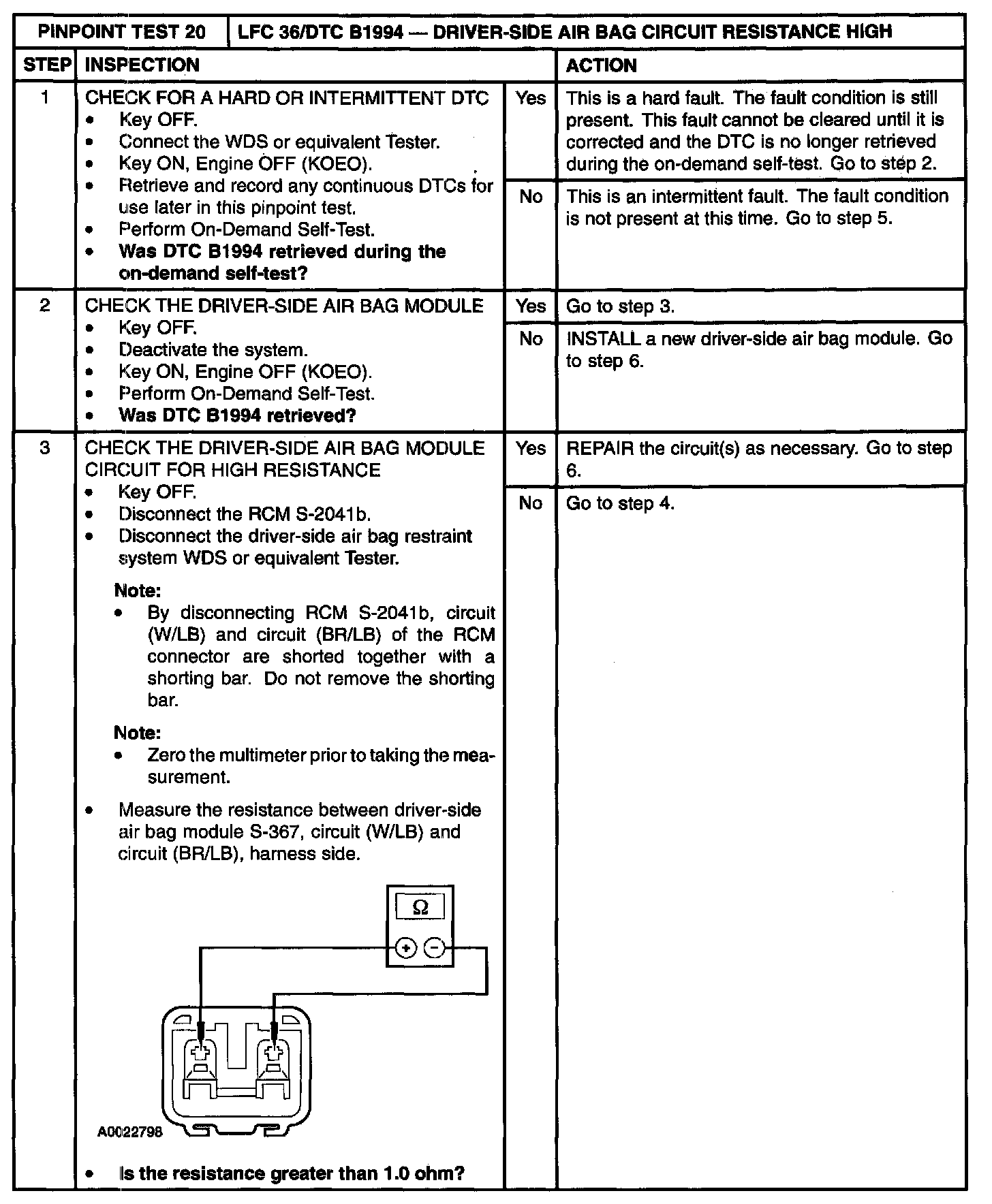 The restraints control module (RCM) monitors the resistance of the driver-side air bag circuit loop and the air bag module igniter at RCM S-2041 a and S-2041 b, pins 2 and 3. If the resistance is greater than 3.6 Ohm, the RCM will store diagnostic trouble code (DTC) B1994 and flash lamp fault code (LFC) 36.