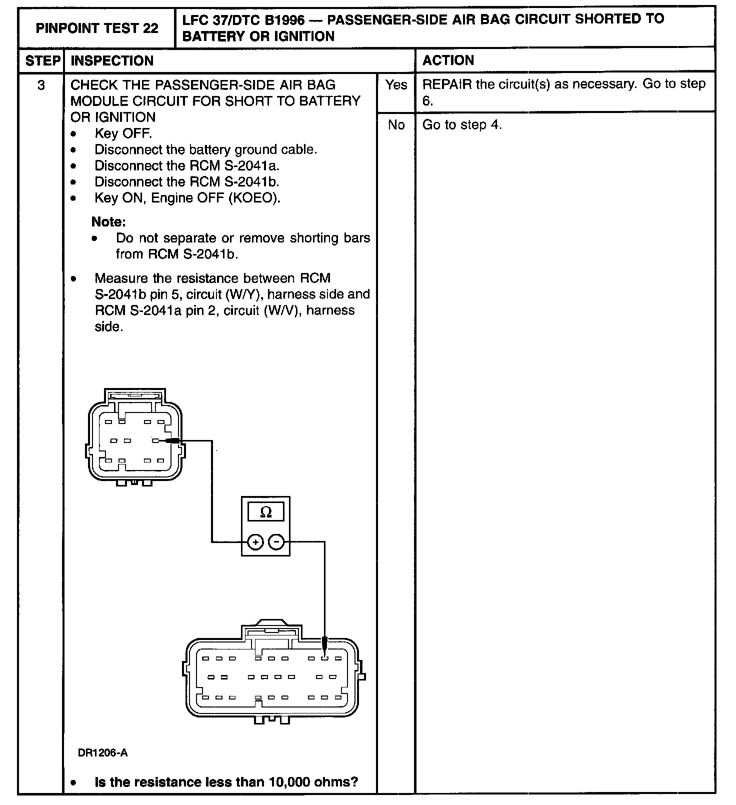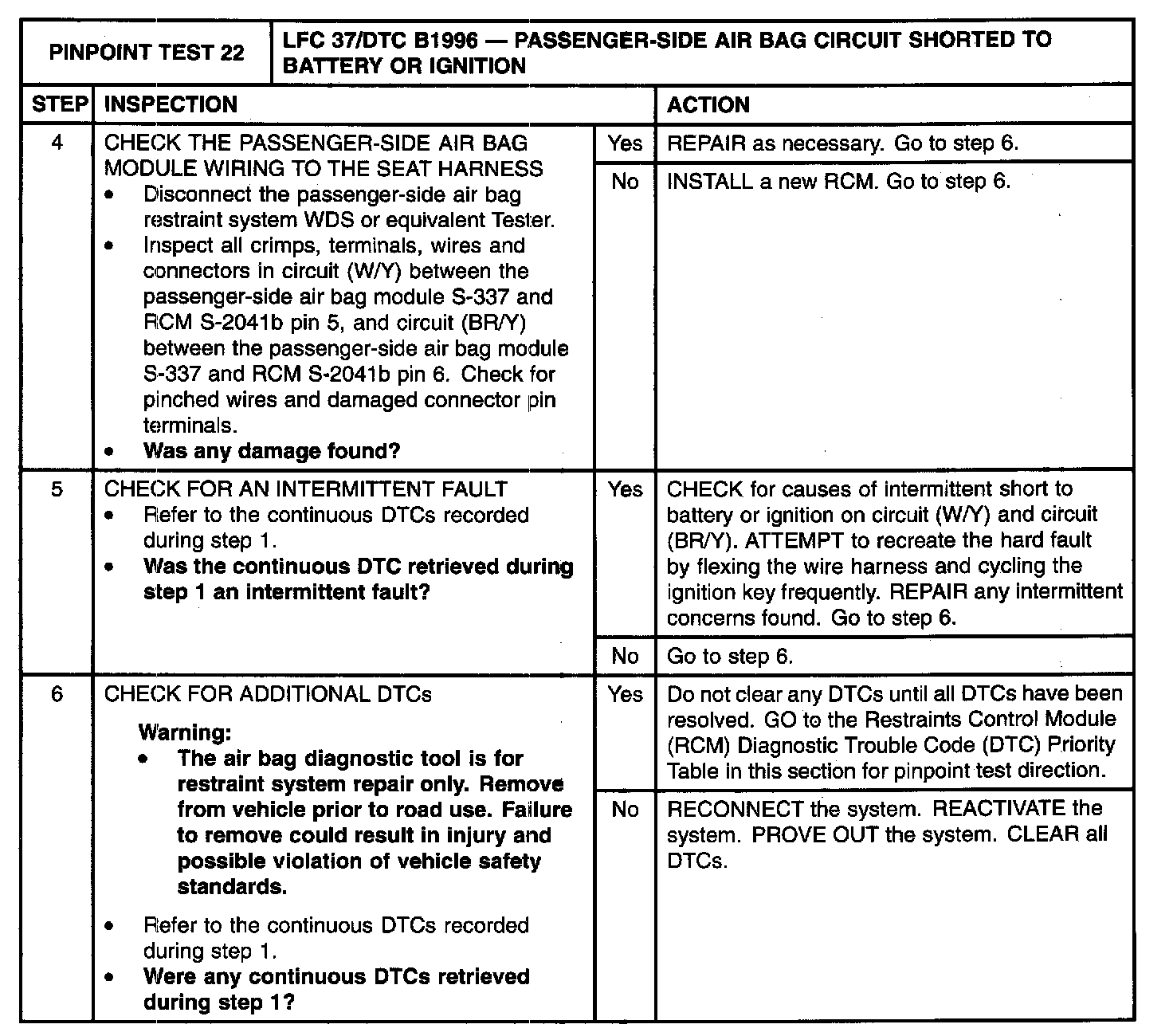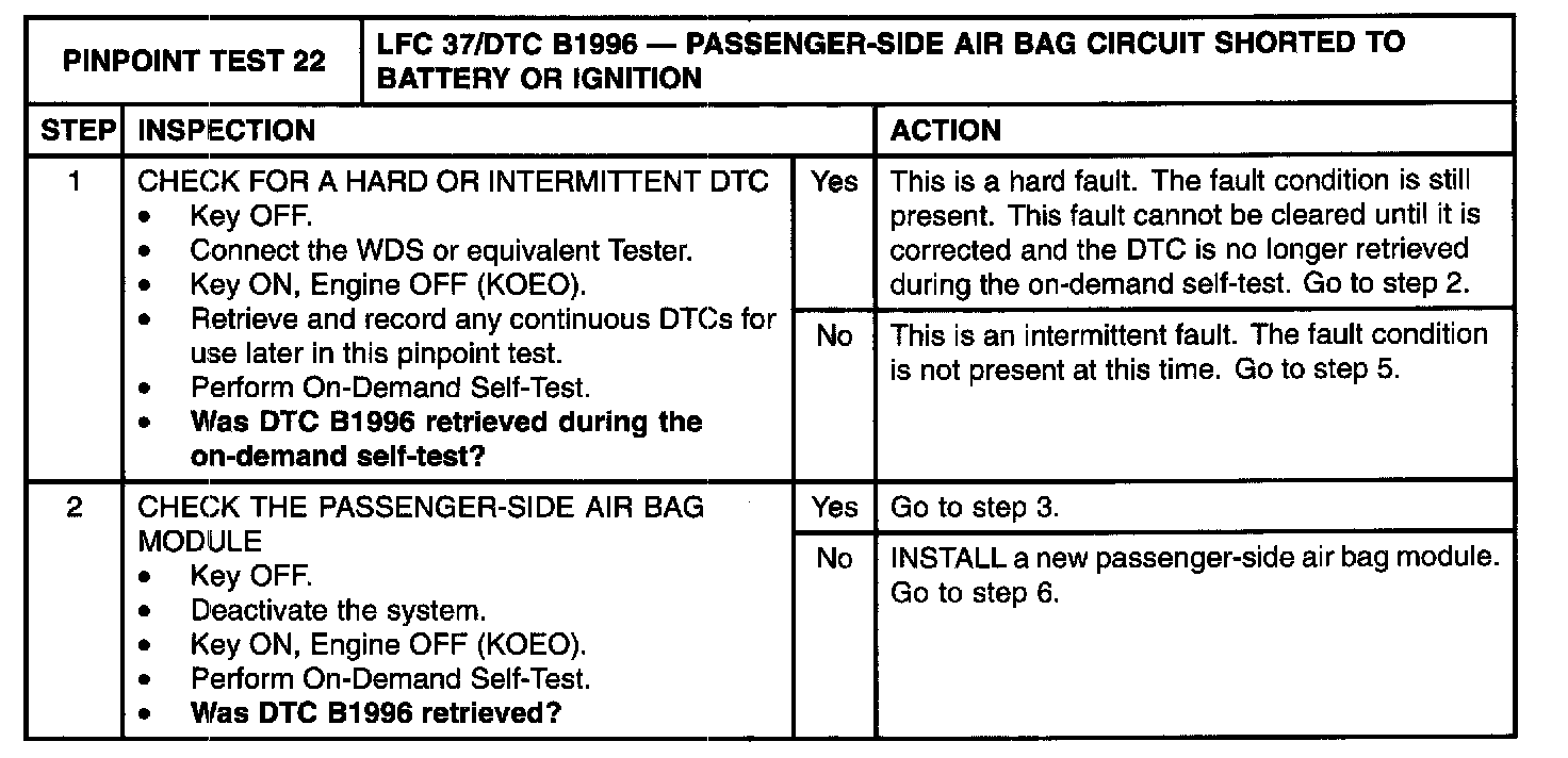 The restraints control module (RCM) monitors the passenger-side air bag circuits at RCM S-2041a and S-2041b, pins 5 and 6 for a short to battery or ignition. If battery or ignition voltage is detected, the RCM will store diagnostic trouble code (DTC) B1996 and flash lamp fault code (LFC) 37.