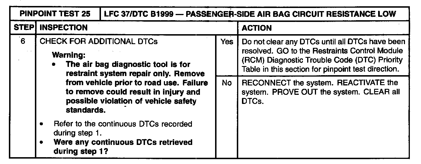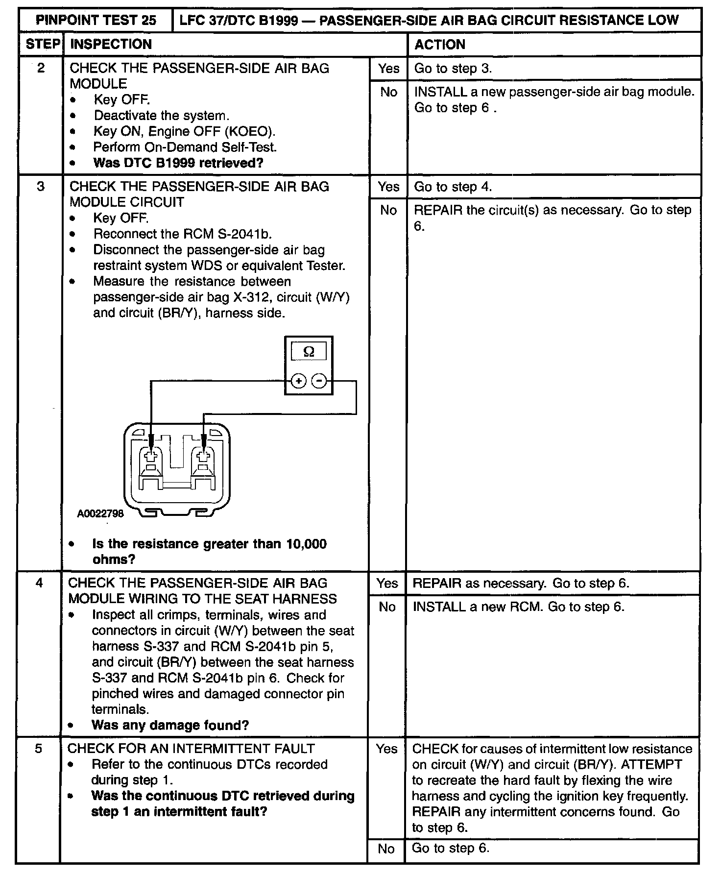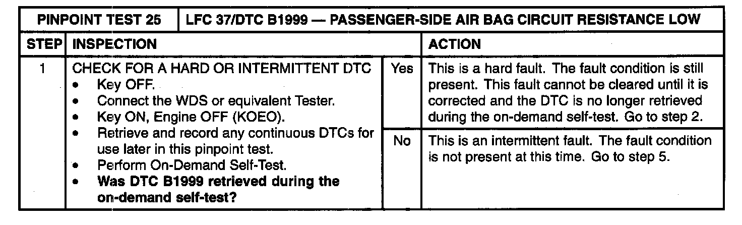 The restraints control module (RCM) monitors the resistance of the passenger-side air bag circuit loop and the air bag module igniter at RCM S-2041a and S-2041b, pins 5 and 6. If the resistance is less than 1.4 Ohm, the RCM will store diagnostic trouble code (DTC) B1999 and flash lamp fault code (LFC) 37.