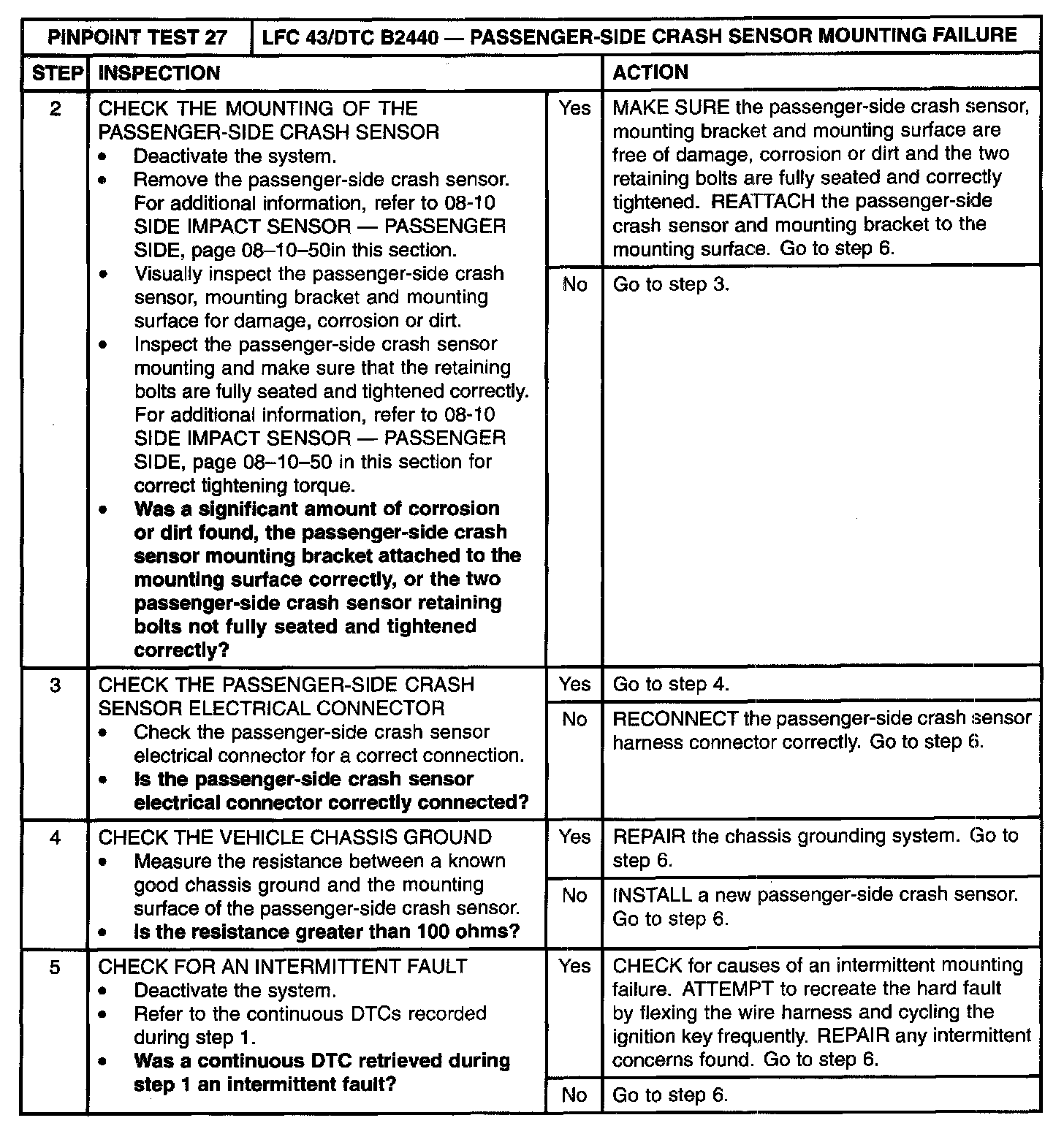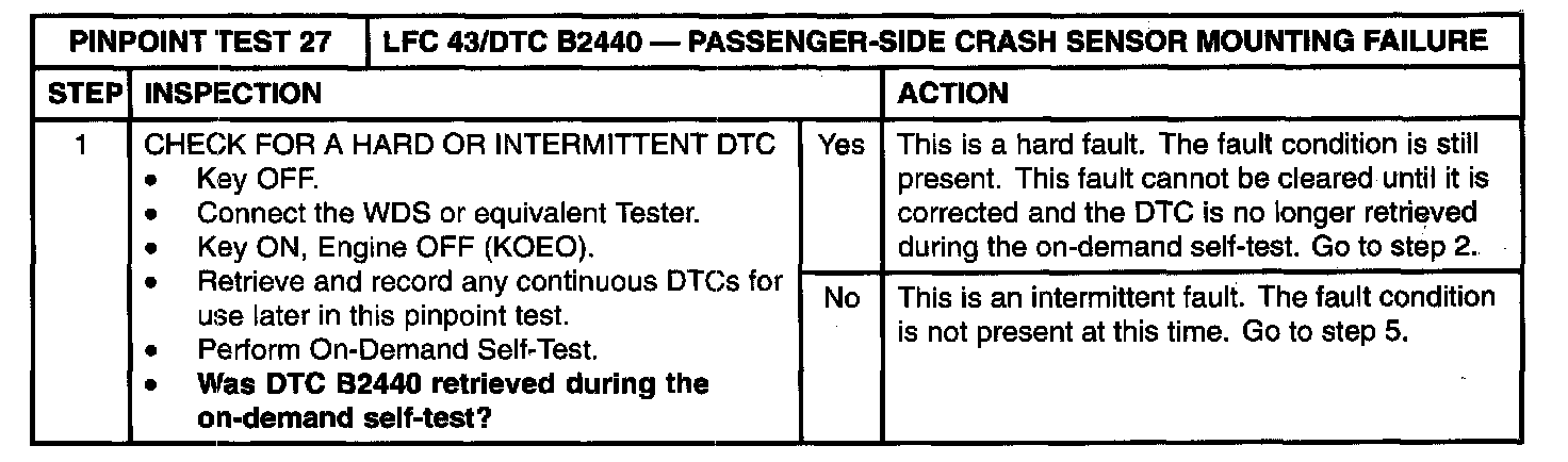 Pinpoint Test 27: LFC 43/DTC B2440 - Passenger-Side Crash Sensor Mounting FailureNormal Operation