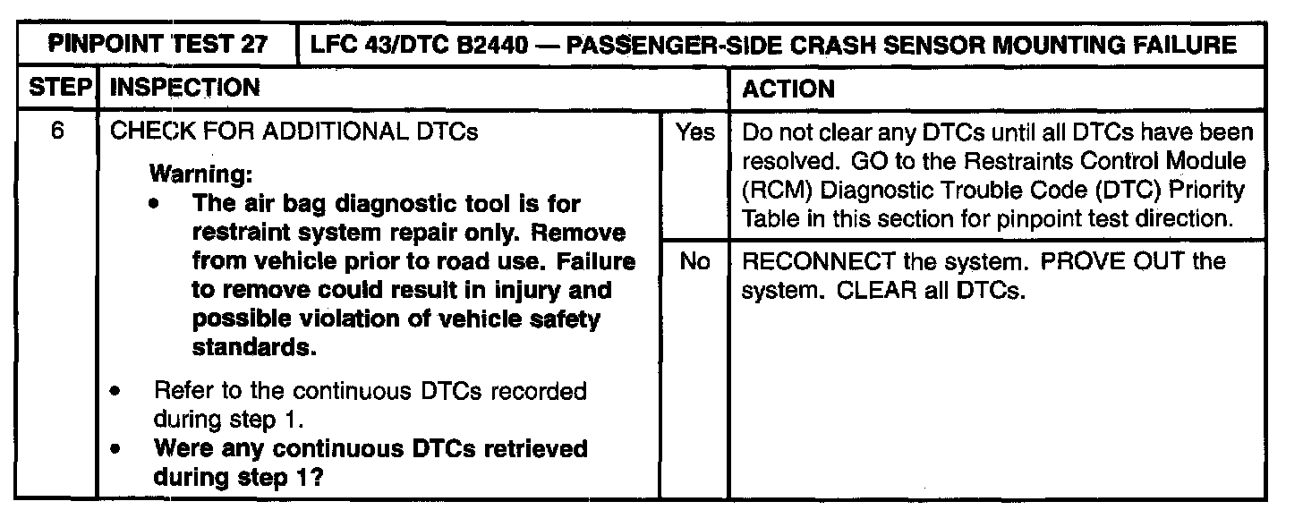 The RCM monitors the two-wire current loop to the passenger-side crash sensor for a signal that is out of the expected range. If the RCM detects a signal from the passenger-side crash sensor, indicating a sensor mounting failure, it will store diagnostic trouble code (DTC) B2440 and flash a lamp fault code (LFC) 43 (or a higher priority code if one exists) on the air bag indicator.