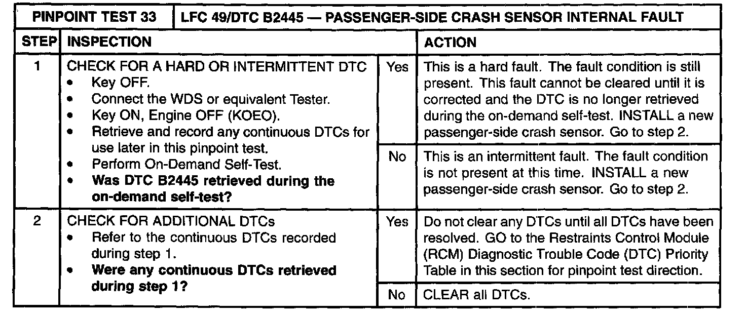 Pinpoint Test 33: LFC 49/DTC B2445 - Passenger-Side Crash Sensor Internal FaultNormal Operation
