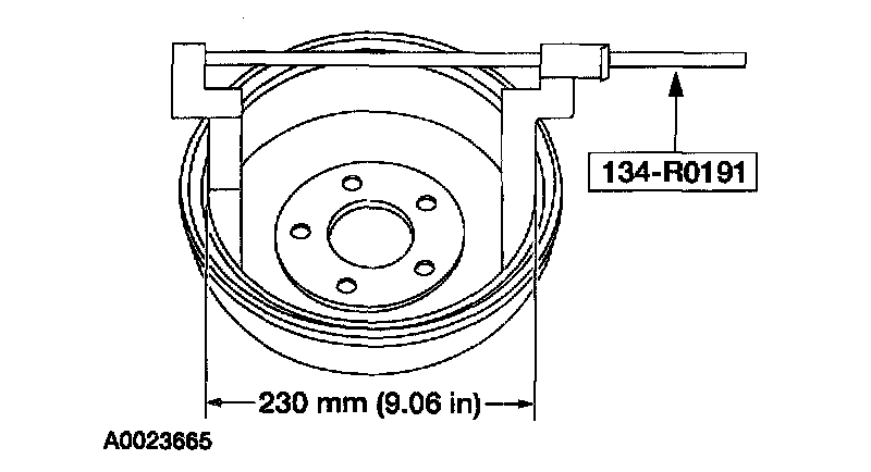 3. Using the special tool, measure the braking surface diameter. If the inside diameter measures more than the maximum specification shown on the outside of the brake drum, install a new brake drum.