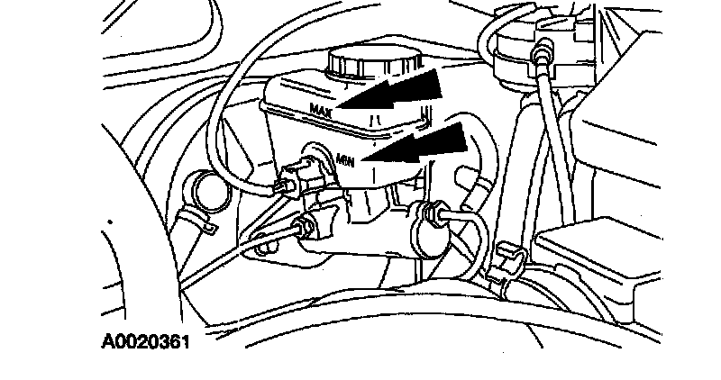 BRAKE SYSTEM LEAK CHECK1. Check the brake fluid level. If the fluid level is below the MIN line on the brake master cylinder degas bottle add the necessary amount of DOT 3 brake fluid.