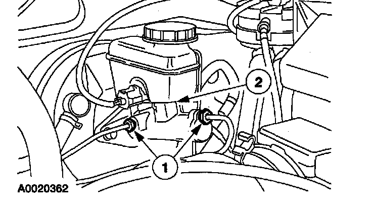 2. Inspect the (1) brake line nuts and the (2) brake master cylinder degas bottle for fluid leaks.