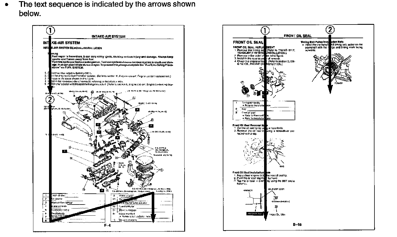 - Symptom troubleshooting shows diagnostic procedures, inspection methods, and proper action to take for each trouble symptom.