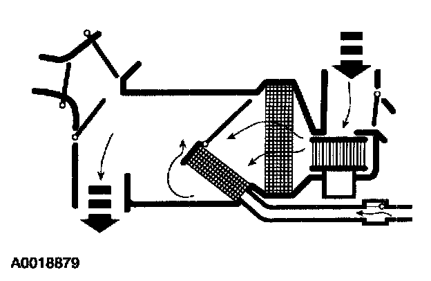 - Air is picked up at the recirculation opening by the blower motor. With the temperature control set for maximum cold, air flows across the A/C evaporator core, diverting past the heater core and then directed into the passenger compartment through the driver-side, passenger-side and center registers.