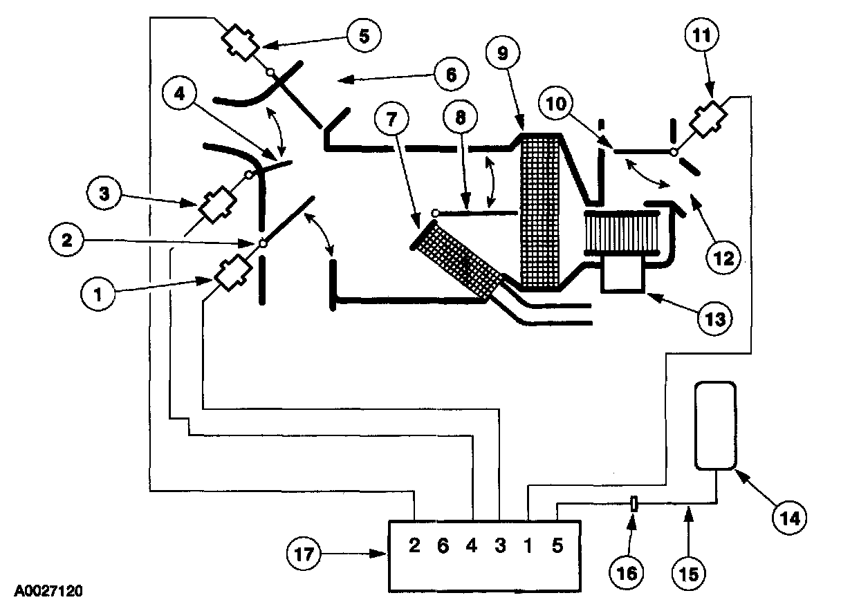 NOTE: A leak in the vacuum control circuits will send all airflow to the defroster outlets. This condition may occur during acceleration indicating a slow leak, exist at all times indicating a large leak, or it may exist only when specific functions are selected indicating a leak in that portion of the circuit.