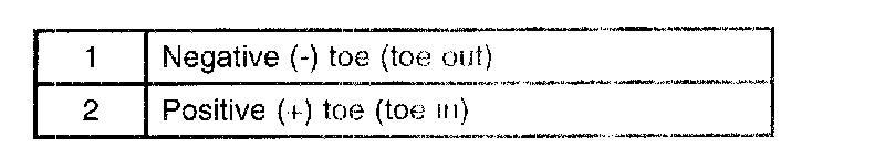 When the wheels are turned in toward the front of the vehicle, toe is positive (+) (toe in). When the wheels are turned out toward the front of the vehicle, toe is negative (-) (toe out). Toe is measured in degrees from side to side, and totaled.