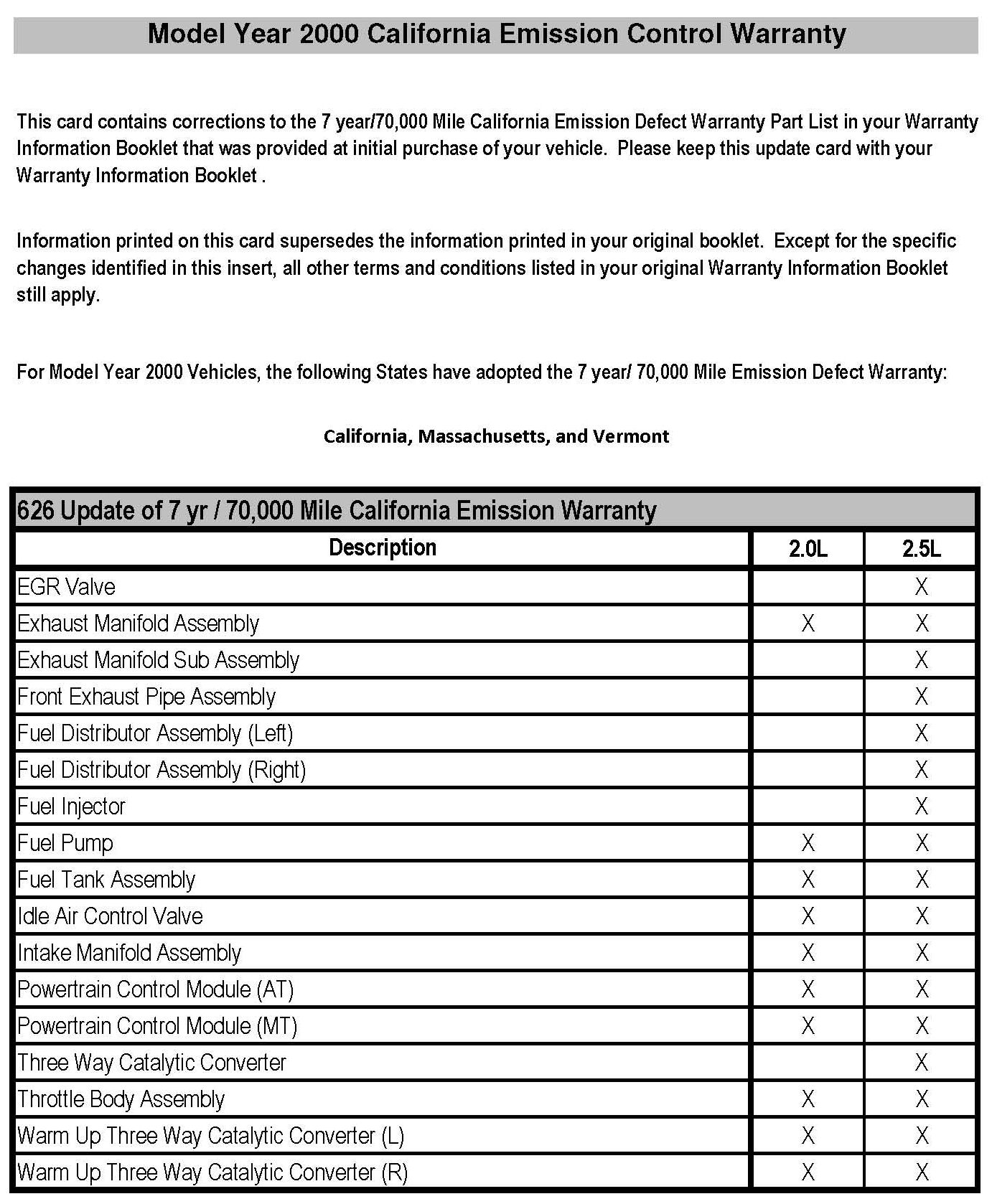 Model Year 2000 California Emission Control Warranty