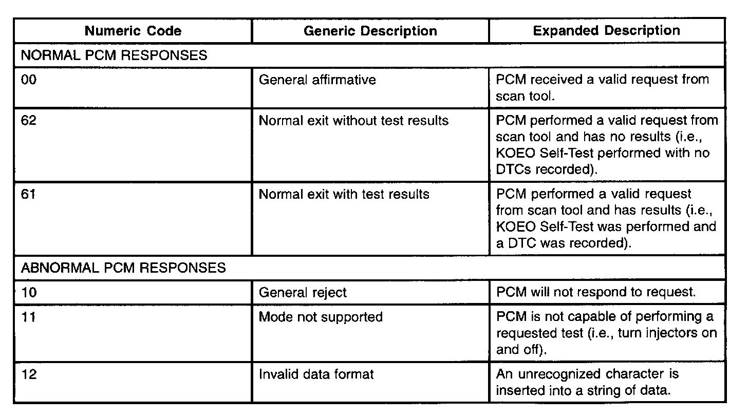 It is possible to receive a communication error from a WDS or equivalent when initiating a diagnostic test or accessing PIDs. The communication error can be caused by operator error, the vehicle wiring, connectors, the PCM or other control modules connected to the DLC wiring. The PCM will respond to a WDS or equivalent whenever the tool requests a test. These are not DTCs. Listed in the table are numeric codes and generic descriptions that a scan tool may display when trying to perform some PCM operations. It is possible to get other numeric codes not listed. For a complete list of communication response codes, Refer to Society of Automotive Engineers (SAE) document J2190 enhanced E/E Diagnostic Test Modes. Some are normal responses to valid requests. The others are communication error responses. If the tool displays any of the communication error responses check scan tool connections, cable/adapters and entry of vehicle information.