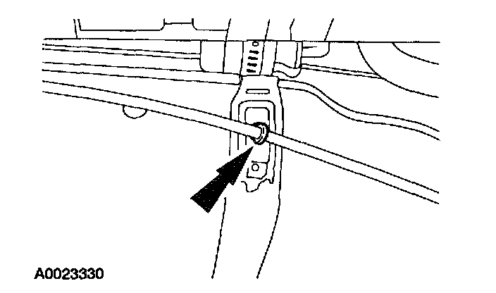 14. Disconnect the pin-type retainer from the fuel tank strap and position the parking brake cable aside.