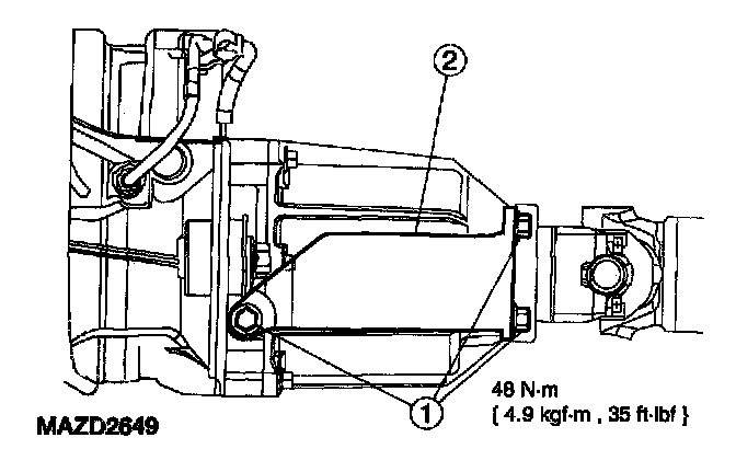2. Loosen the differential mounting bracket-to-subframe mounting bolts (1), rotate the brackets and position the axle assembly rearward.