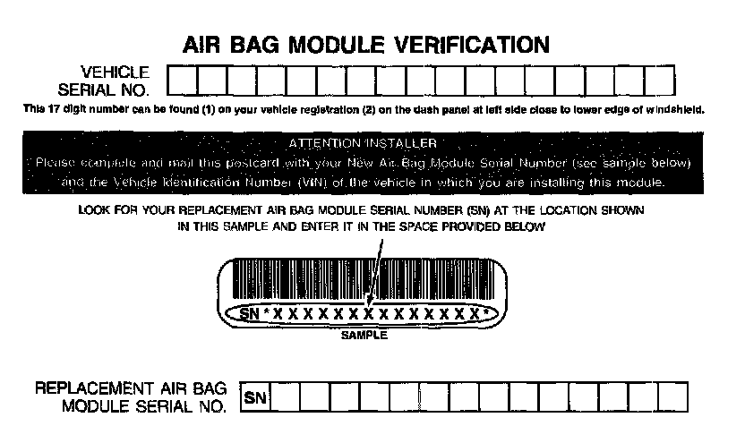 NOTE: When installing a new air bag module, a prepaid return postcard is provided with the replacement air bag module. The serial number for the new part and the vehicle identification number (VIN) must be recorded and sent to Mazda Motor Corporation.