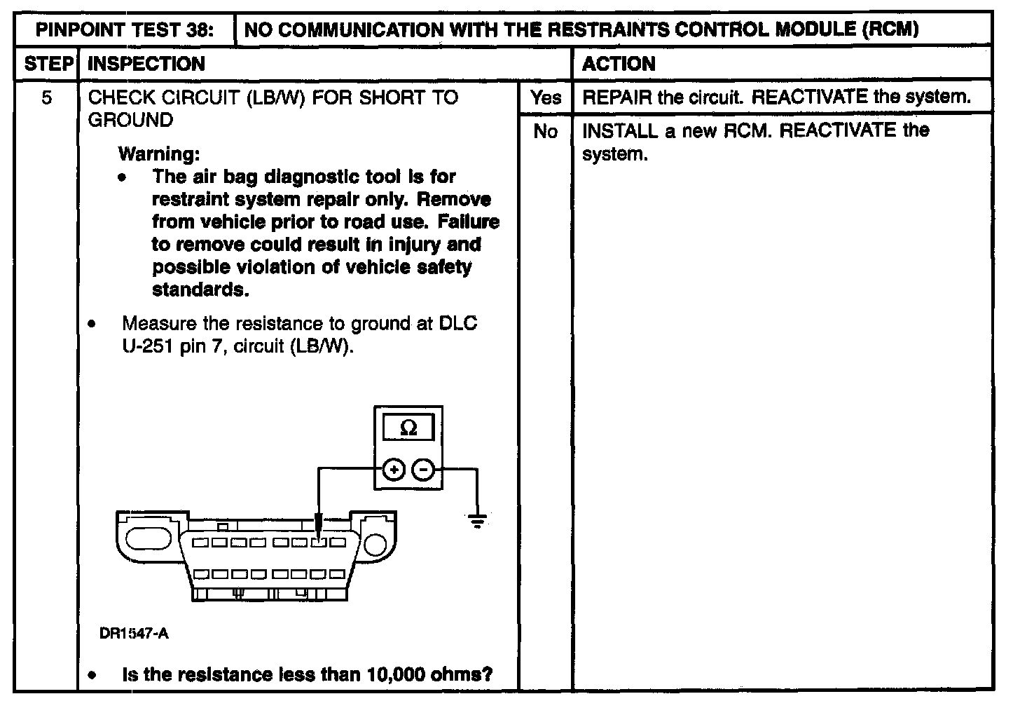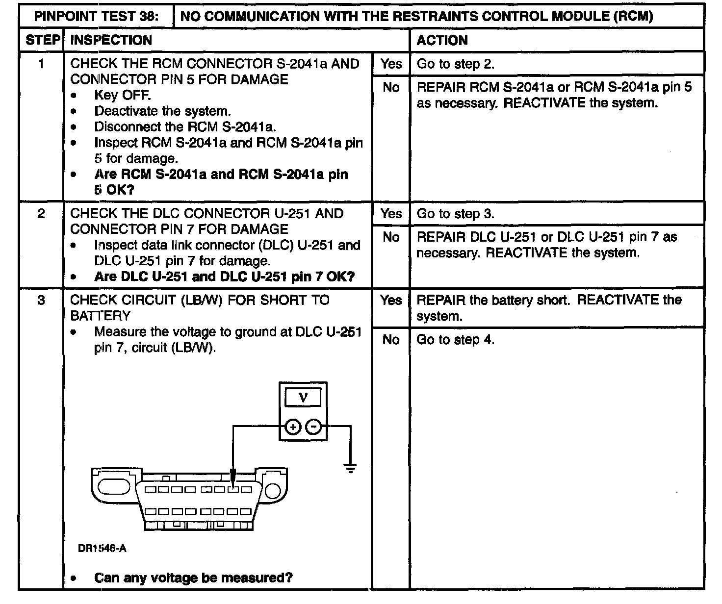 Pinpoint Test 38: No Communication with the Restraints Control Module (RCM)Normal Operation