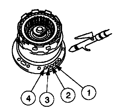 12. Check the following passages of the forward/coast/direct clutch cylinder and reverse clutch drum with moisture-free compressed air, regulated to 276 kPa (40 psi).