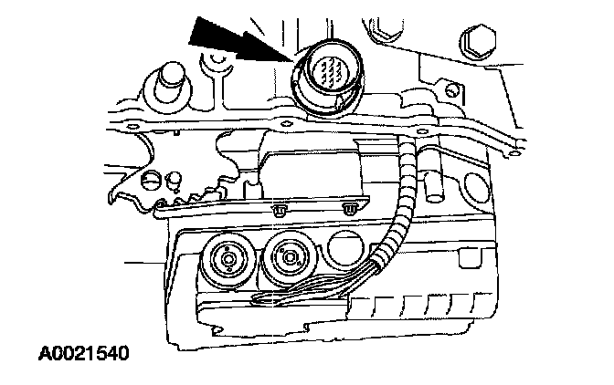 16. Depress the retaining tabs and push the solenoid valve body electrical connector down through the transaxle case.