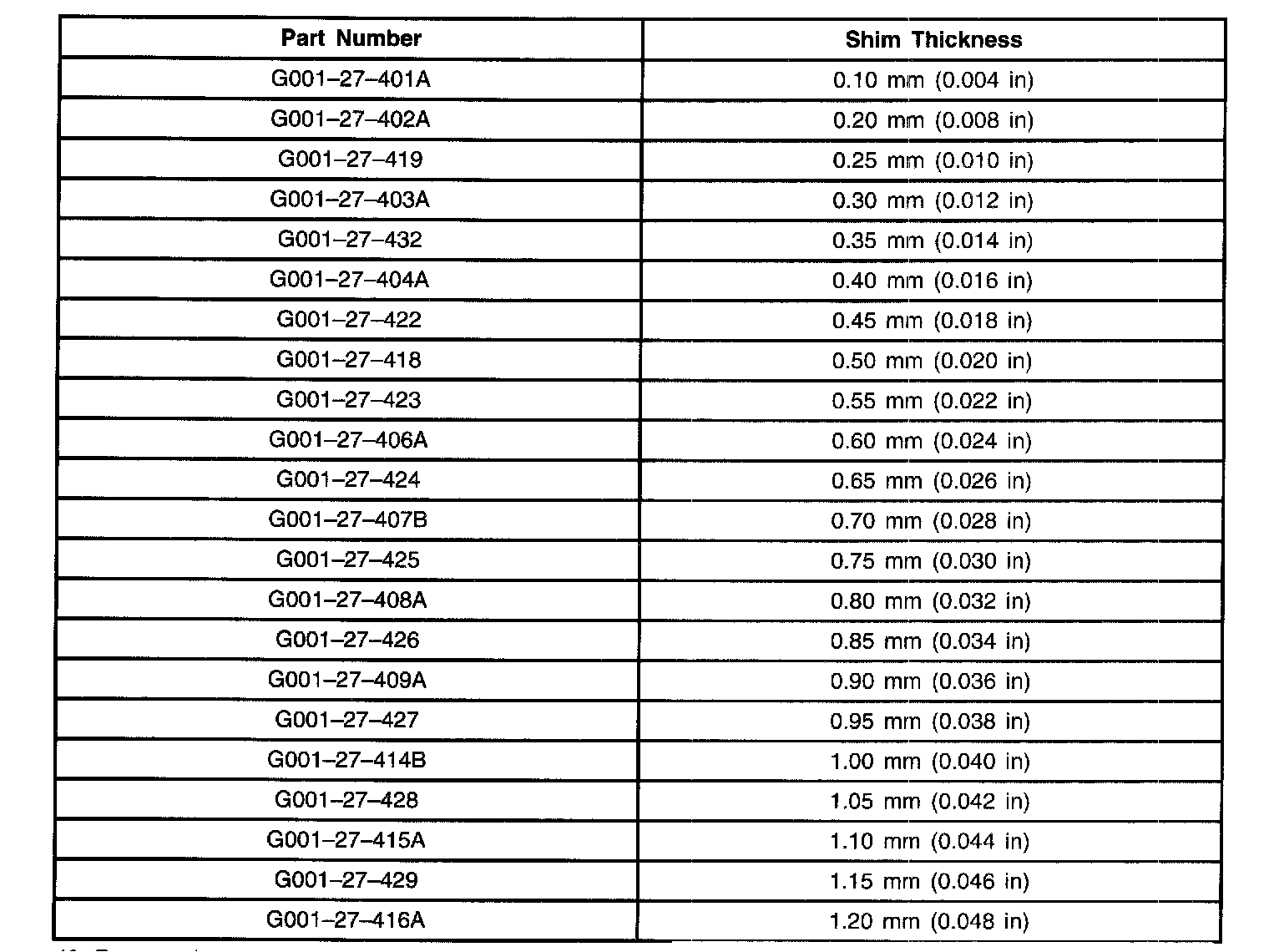 41. Use the following chart to select the differential bearing shims that are closest to (or slightly larger than) the value obtained in Step 40.