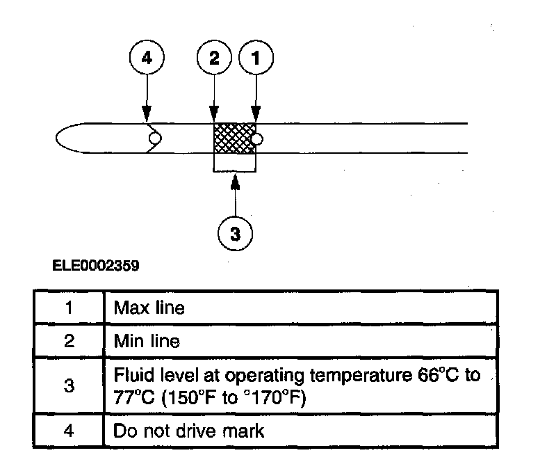 Caution: The vehicle should not be driven if the fluid level is below the bottom hole on the fluid level indicator and the outside temperature is above 10°C (50°F).