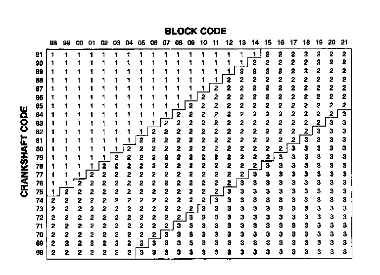 ^ For example: If the block code is *0609*0711* and the crankshaft code is *8480*8082*, main No. 1 should use grade 1 bearings, as deter mined by the intersection of the 06 block column and the 84 crankshaft row. Mains 2, 3 and 4 should all be grade 2.