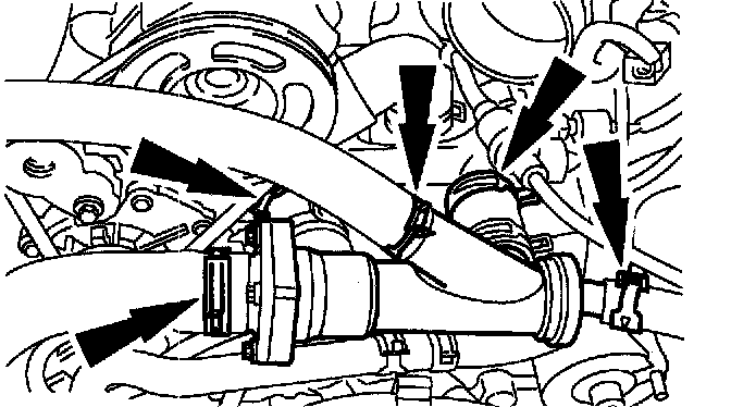 3. Disconnect the five hoses from the thermostat housing and remove the thermostat housing.