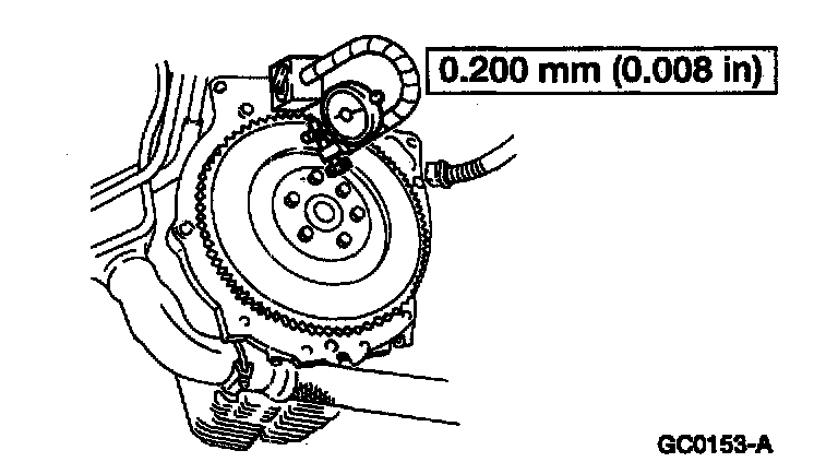 2. Rotate the flywheel and check the runout. If the runout exceeds the maximum allowance, install a new flywheel.