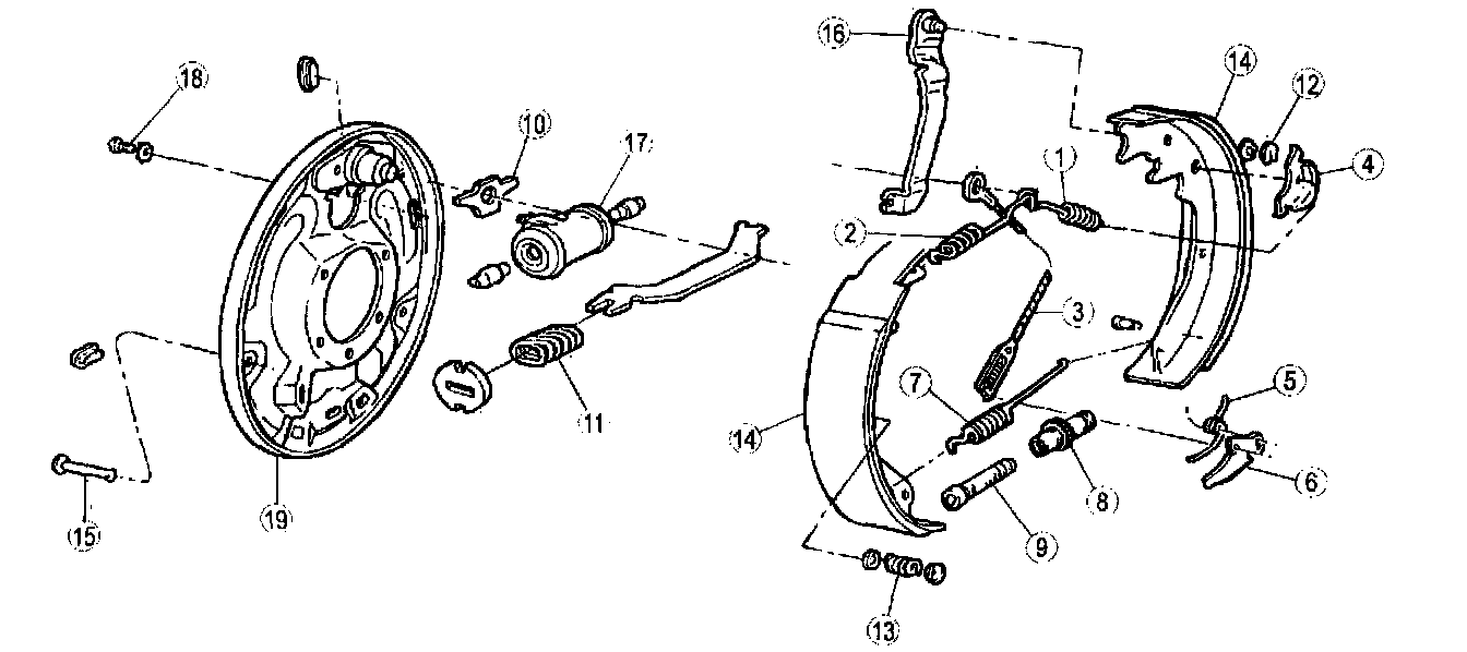 1. Remove the brake shoe anchor pin guide plate, parking brake strut and the parking brake lever pin retainer.