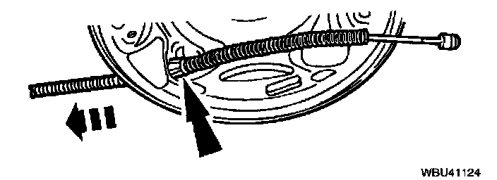 2. Compress the cable retainer and pull the parking brake rear cable and conduit from the brake backing plate.