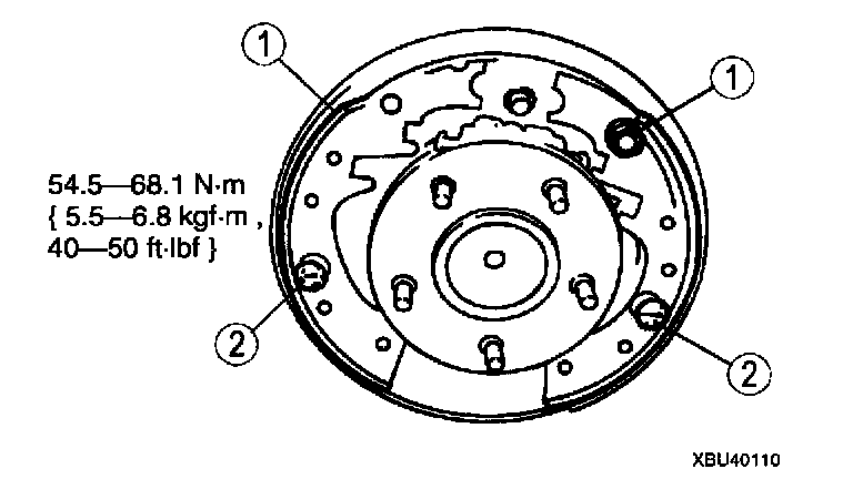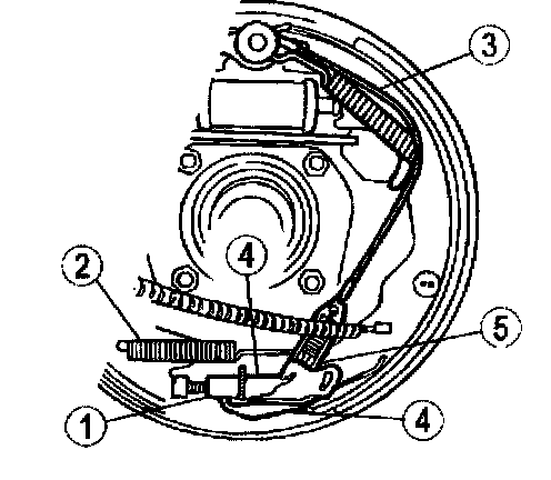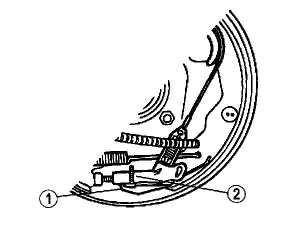 5. Install the brake shoe hold-down spring pins and the brake shoe hold-down springs (2).