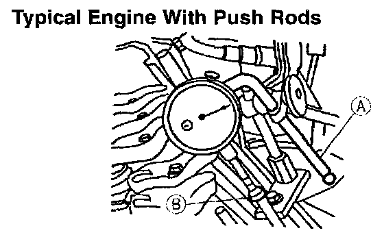 3. Make sure the valve tappet is seated against the camshaft. Install a suitable Dial Indicator with Bracketry (A) so the ball socket adapter of the indicator is on top of the valve tappet or Cup Shaped Adapter (B) is on top of the push rod and in the same plane as the valve tappet push rod movement.