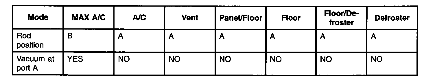 - If vacuum at port A appears in A/C, Vent, Panel/Floor, Floor, Floor/Defroster and Defroster modes, check the vacuum control valve.