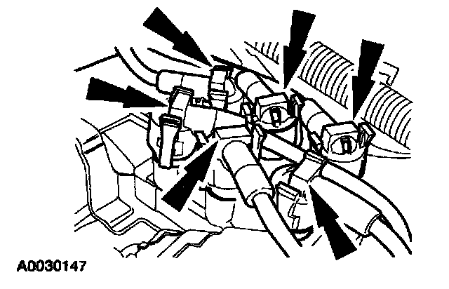 6. Squeeze the locking tabs and twist while pulling upward to remove the spark plug wires from the ignition coil.