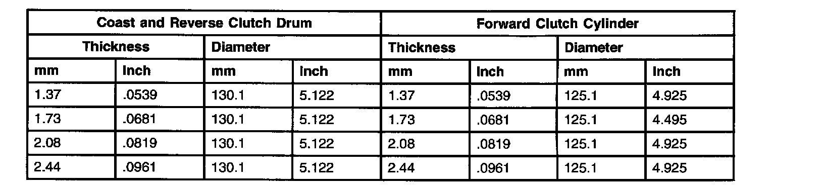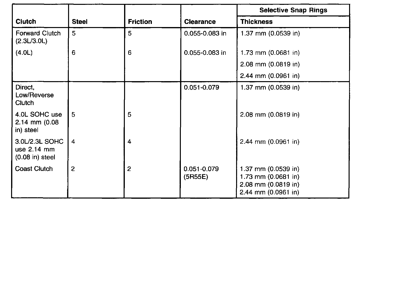 Clutch Plate Usage And Clearance Specifications (5R44E 5R55E)