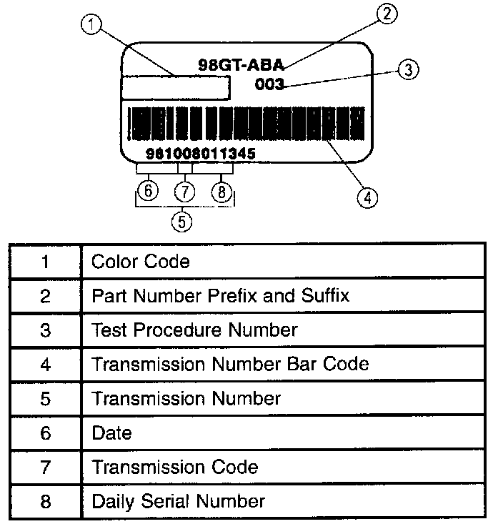 All vehicles are equipped with a Vehicle Certification Label, located on the driver side door lock post. Refer to the code in the space marked TR. For model, service ID level or build date information, refer to the transmission service ID tag located on the transmission case.