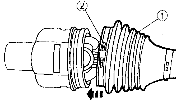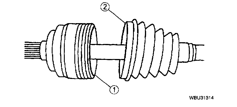 1. Pack the outboard CV joint (1) with appropriate grease (2). Spread any remaining grease evenly inside the outboard driveshaft boot.