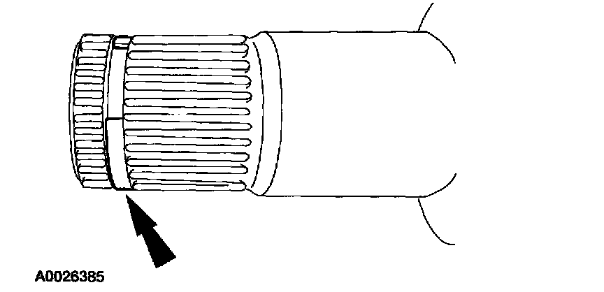 ^ Install a new retainer circlip in the groove in the LH inboard CV joint housing stub shaft before installing the drive axle shaft and joint assembly in the vehicle. To prevent the new retainer circlip from overexpanding when installing it, start one end in the groove and work the circlip over the shaft and into the groove.