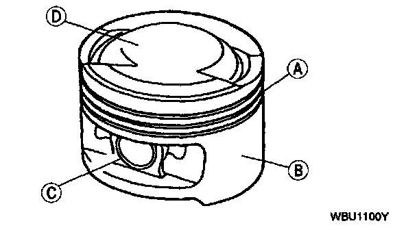 1. Clean and inspect the (A) ring lands, (B) skirts, (C) pin bosses, and the (D) top of the pistons. If wear marks or polishing are found on the piston skirt, check for a bent or twisted connecting rod.