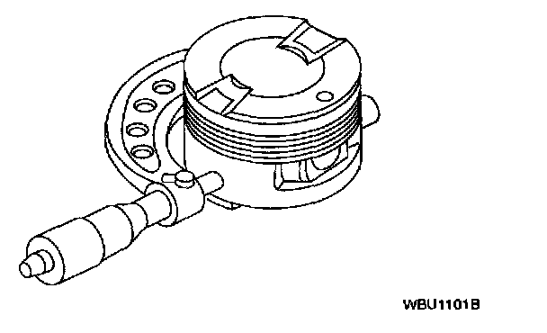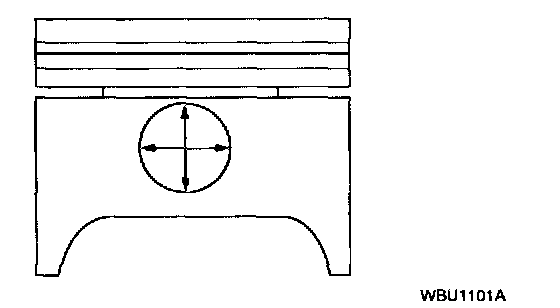 4. Measure the piston bore and skirt diameter 90 degrees from the piston pin as indicated.
