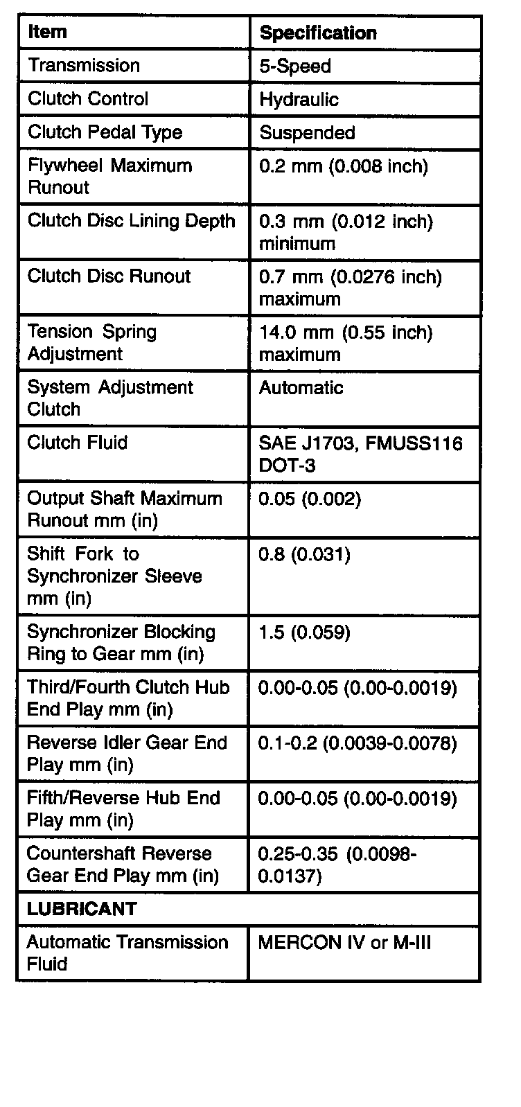 MANUAL TRANSMISSION AND CLUTCH SPECIFICATIONS