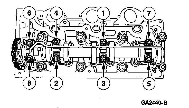 ^ The camshaft bearing caps must be installed in the original position.