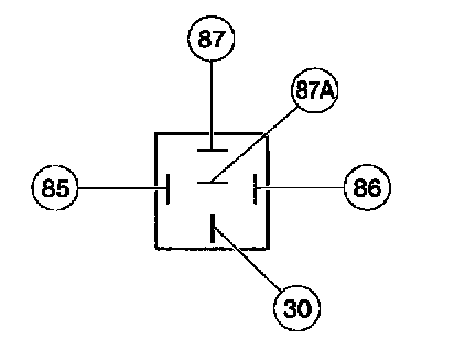 Check for the continuity between terminal 85 and all other terminals. If the resistance is 5 ohms or less between terminal 85 and any other terminal, replace the relay. If the resistance is greater than 5 ohms, continue with the test. Use two jumper wires to connect relay terminals 86 and 30 directly to the positive battery terminal. Check for voltage at terminal 87A. If battery voltage is not indicated, replace the relay. If battery voltage is indicated, connect a third jumper wire to terminal 85, and ground the jumper wire to a known good ground. Check for voltage at terminal 87. If battery voltage is not indicated, replace the relay.