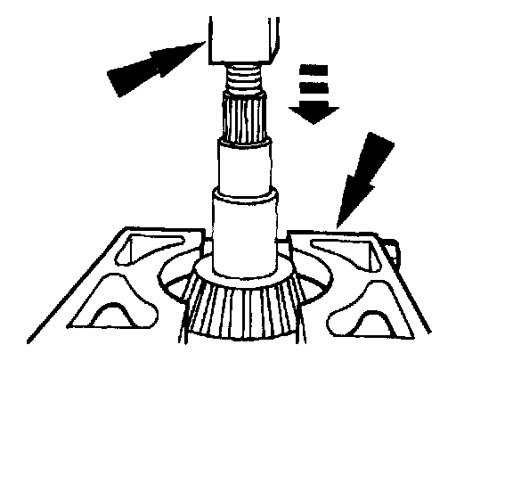 (2) Position the Pinion Bearing Cone Remover 205-055 or equivalent and the differential pinion bearing assembly in a press.