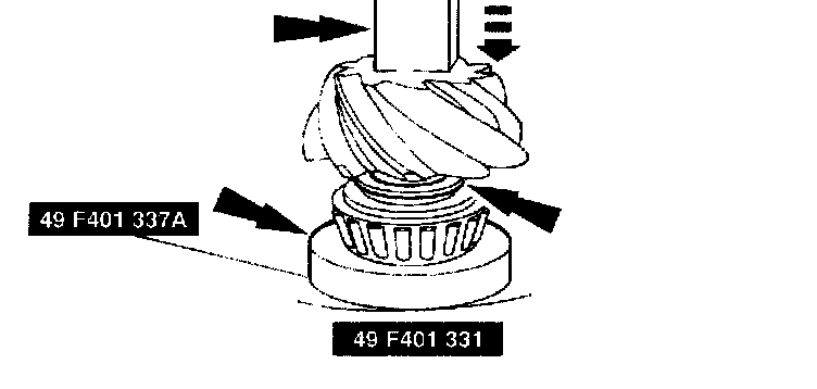 (2) Use Bearing Installer Set ST 49 F401 331 and Attachment C ST 49 F401 337A to press the differential pinion bearing until it is firmly seated on the pinion and pinion position shim.