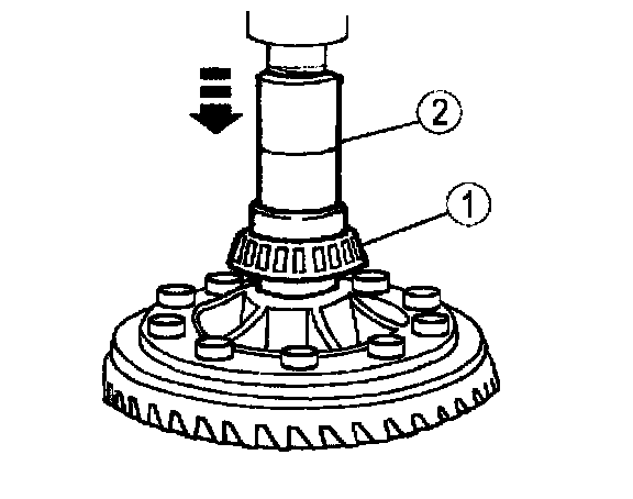 20. Remove the oil slinger (1) and the differential pinion bearing (2).