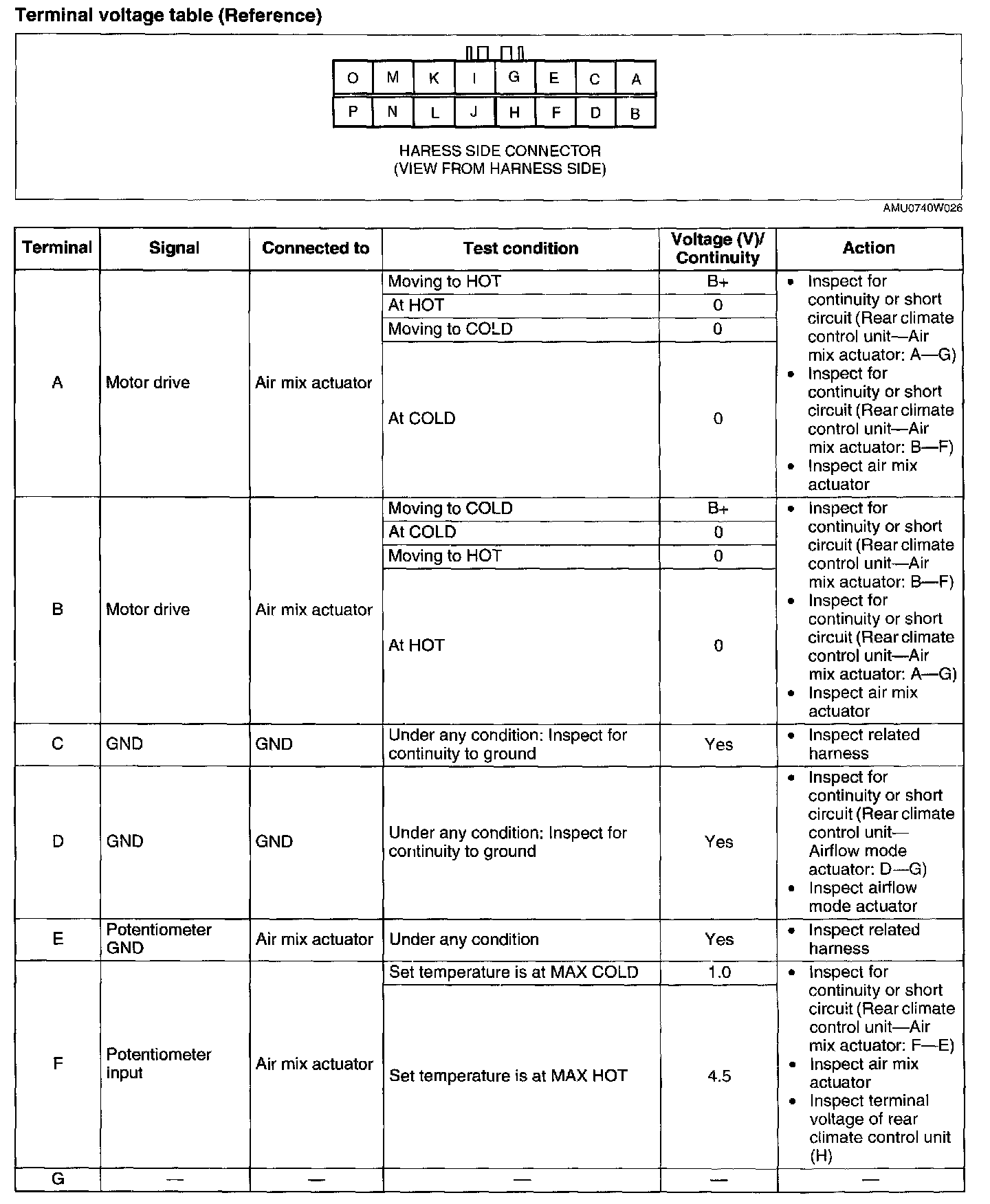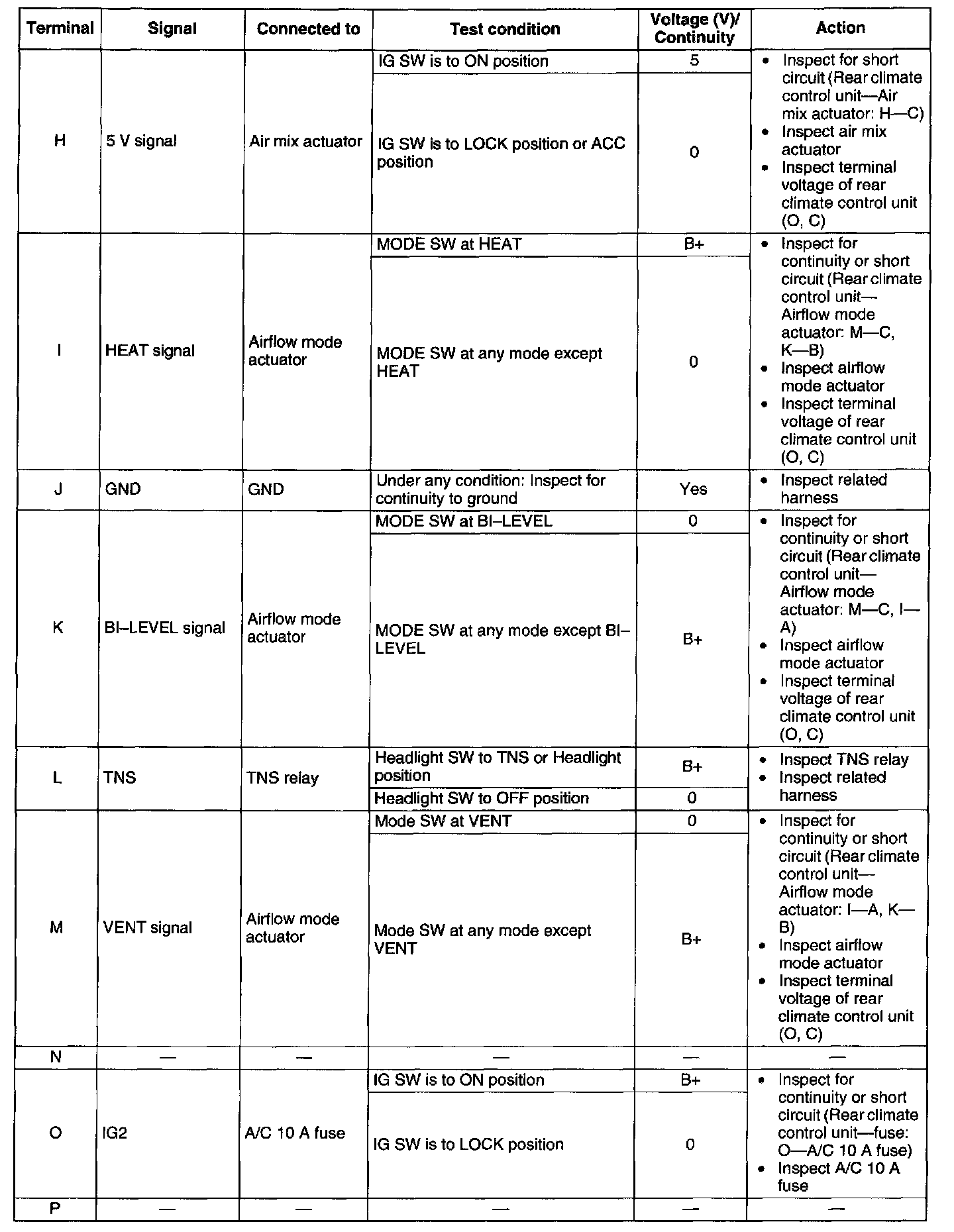 3. Measure the voltage at each rear climate control unit terminal and refer to terminal voltage list.